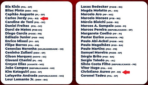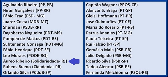 Os 39 deputados federais favoráveis à PEC 32 na CCJC estão no quadro abaixo. As setas indicam os parlamentares da bancada fluminense.